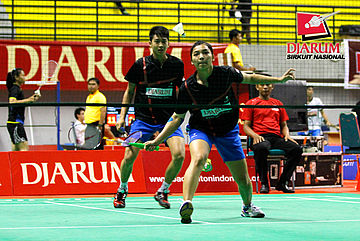 Didit Juang/Nurbeta Kwanrico (PB Djarum) bersiap menghadang pengembalian dari Renaldi/Fauziah Lahia (Hi Qua Wima).