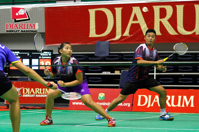 Ricky Alverino/Ristya Ayu (PB Djarum) mengembalikan shuttlecock ke arah Danang Dwi/Syifa Fauziah (Jaya Raya).