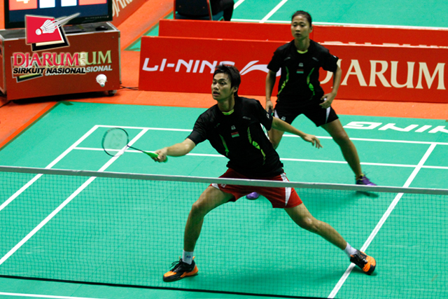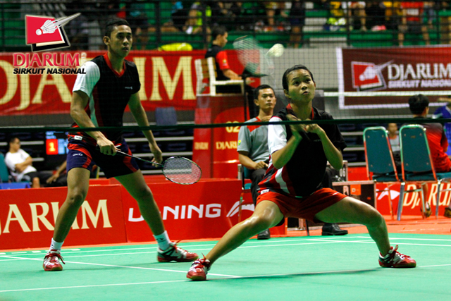 Jeka Wiratama/Chintia Rhizta (PB Djarum) bersiap menyambut pengembalian dari Ade Kurniawan/Suci Ramadhani (Mutiara Bandung).