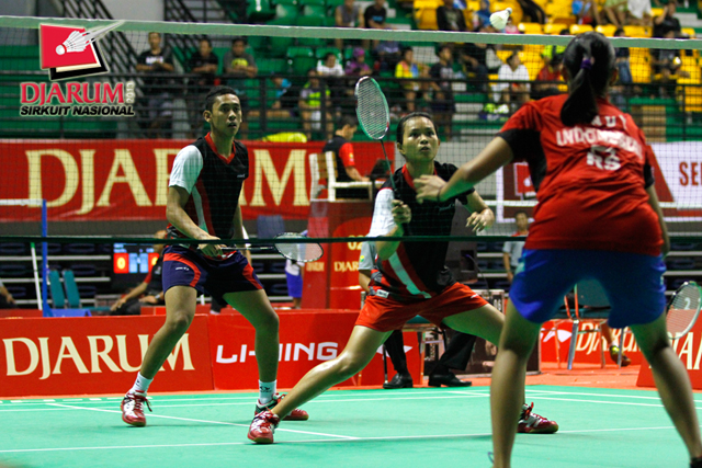 Didit Juang/Nurbeta Kwanrico (PB Djarum) bersiap menghadang pengembalian dari pasangan Ahmad Rivai/Aris Budiharti (Bank Sumsel/Jaya Raya).