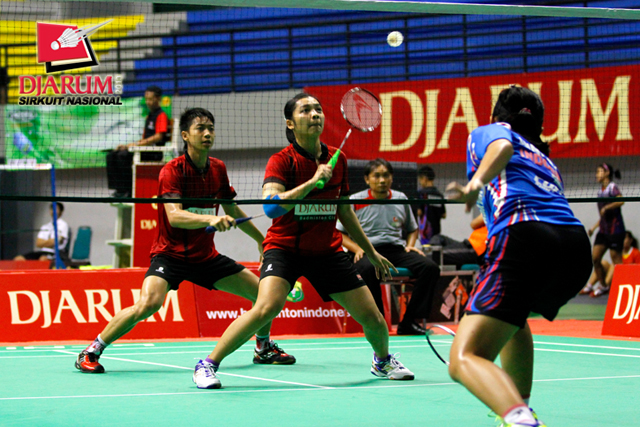 Yodhi Satrio/Ni Ketut Mahadewi (Jaya Raya Suryanaga) mengembalikan shuttlecock ke arah Darmiko/Deariska Putri (PB Djarum).