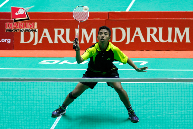 Akbar Gusti/Felicia Parmenas (PB Djarum) bersiap menyambut pengembalian dari Beno Drajat/Rika Rositawati (Mutiara Bandung).