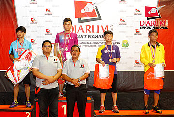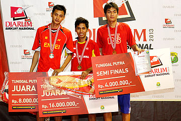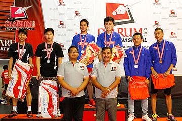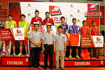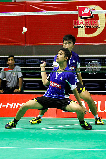 Altof Baariq/Reinard Dhanriano (Mutaiara Bandung) bersiap mengembalikan shuttlecock ke arah Hantoro/Ricky Alverino (PB Djarum).