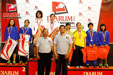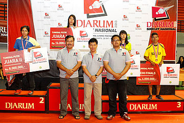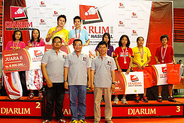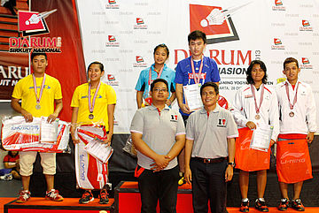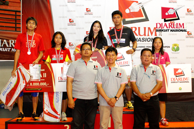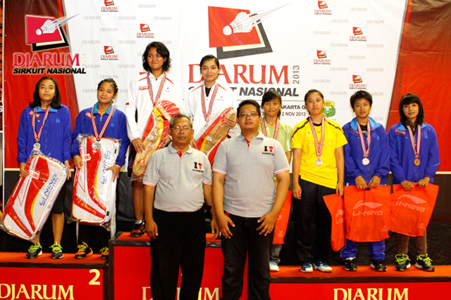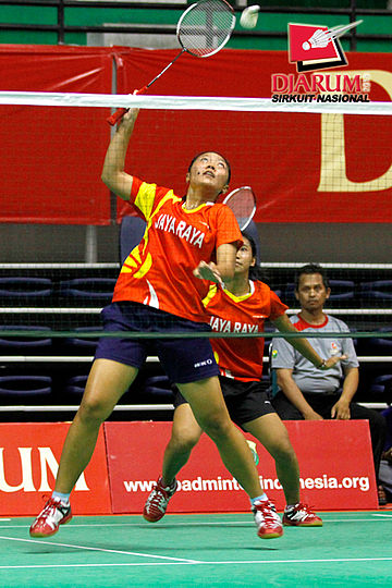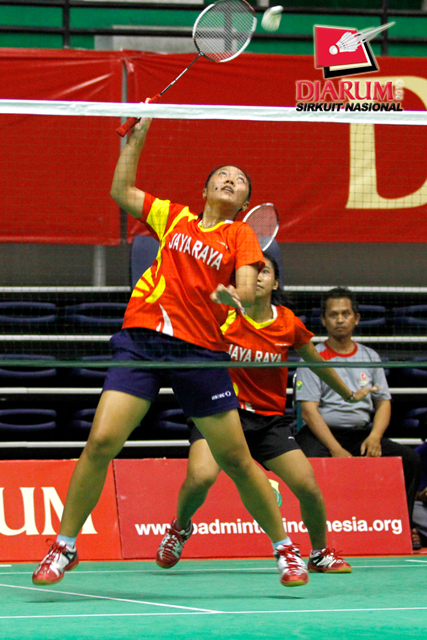 Aris Budiharti/Ery Octaviani (Jaya Raya) mengembalikan shuttlecock ke arah Variella Aprilsasi/Vita Marissa (Jaya Raya Suryanaga/PB Djarum).