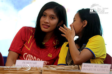 Choirunnisa (PB Mutiara Cardinal) dan P.H Mentari (PB Jaya Raya) Tampak Berbisik Disea-Sela Press Conference Blibli.Com Superliga Junior 2017