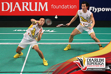 Noriyatsu Hirata/Hirokatsu Hashimoto (Tonami Jepang) menyambut pengembalian dari Hardianto/Ricky Karanda (Mutiara Cardinal).