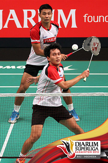 Berry Anggriawan/Moh. Ahsan (Djarum Kudus) mengembalikan shuttlecock ke arah Chayut Triyachart/Watchara Buranakuea (Granular Thailand).