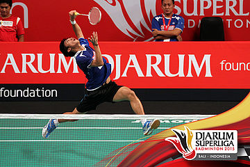 Dionysius Hayom Rumbaka (Djarum Kudus) mengembalikan shuttlecock ke arah Prinyawat Thongnuam (Granular Thailand).