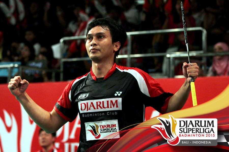 Selebrasi Moh. Ahsan (Djarum Kudus) setelah berhasil memenangkan pertandingan atas Lee Yong Dae/Vladimir Ivanov (Musica Champion).