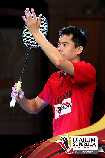 Son Wan Ho (Djarum Kudus) bersiap menyambut serve dari Simon Santoso (Musica Champion).