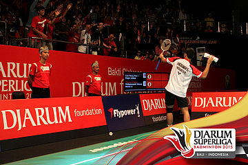 Berry Anggriawan (Djarum Kudus) melemparkan merchandise kepada penonton.