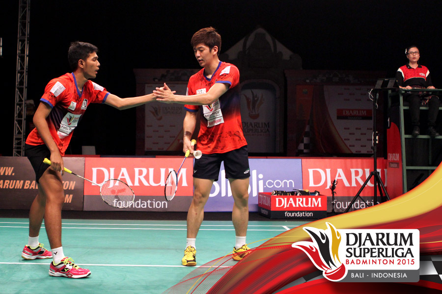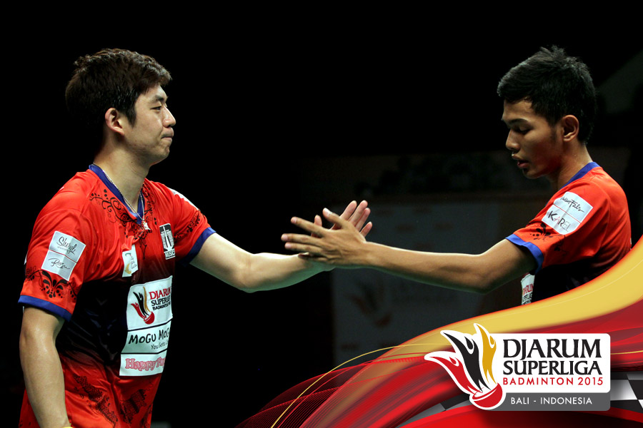 Fajar Alfian/Lee Yong Dae (Musica Champion) dan Berry Anggriawan/M. Ahsan (Djarum Kudus) sebelum bertanding.