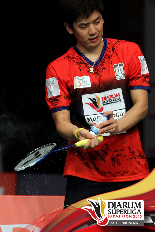 Lee Yong Dae (Musica Champion) saat menaburkan bedak ke raketnya.