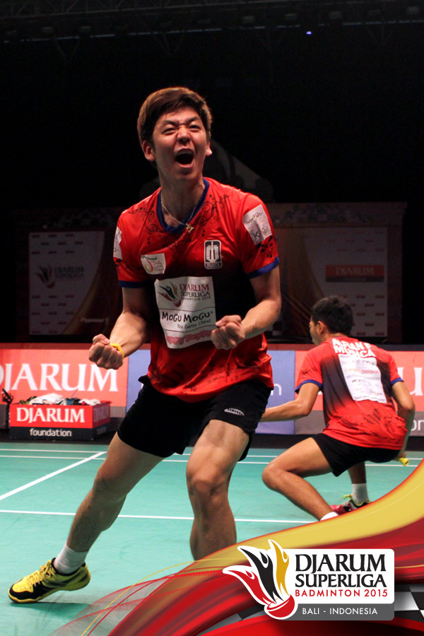 Selebrasi Fajar Alfian/Lee Yong Dae (Musica Champion) setelah berhasil mengalahkan Berry Anggriawan/M. Ahsan (Djarum Kudus).