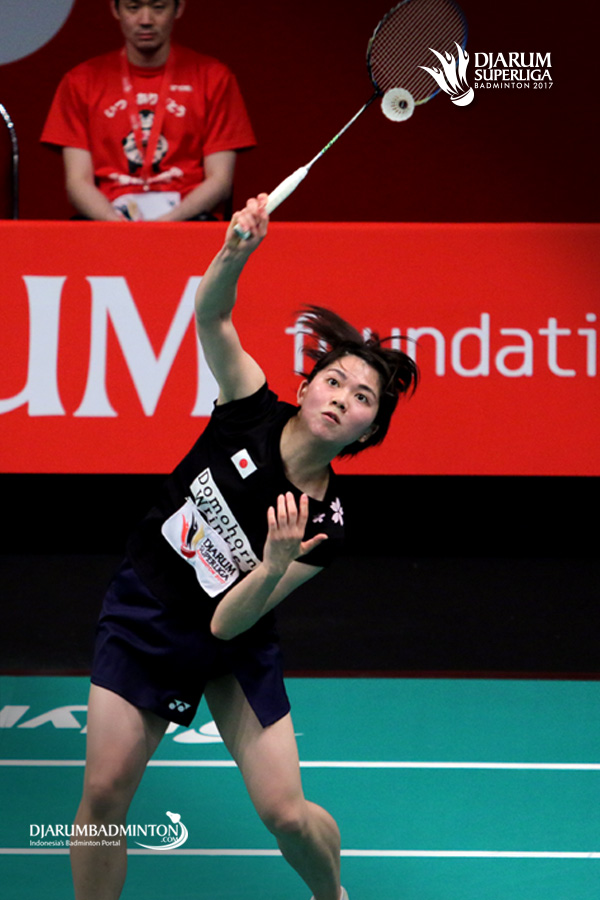Yukino Nakai (Kumamoto Saishukan) bersiap menyambar pengembalian.
