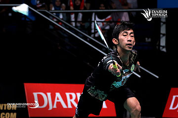 Chou Tien Chen (PB Musica Champion) bersiap menyambut pengembalian.