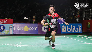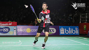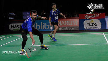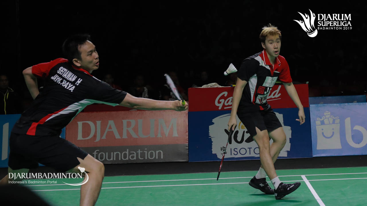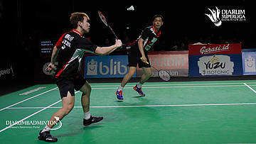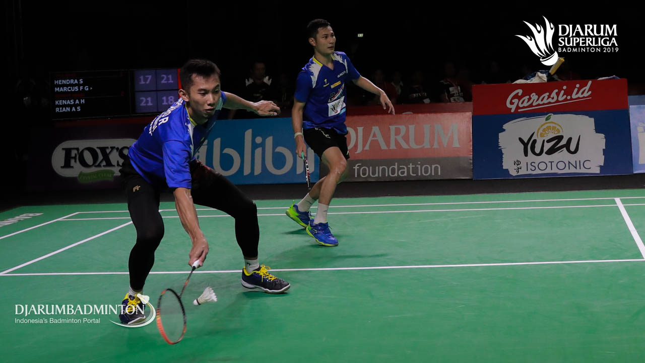 Hendra Setiawan/Marcus Fernaldi Gideon (Jaya Raya Jakarta) menahan serangan