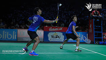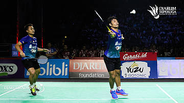 Berry Angriawan/Akbar Bintang Cahyono (Djarum Kudus) menahan serangan
