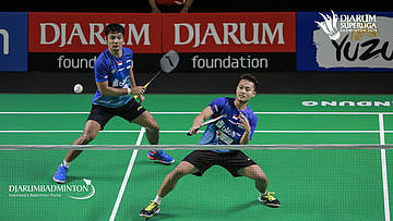 Akbar Bintang CAHYONO+Berry ANGRIAWAN (DJARUM KUDUS) mengembalikan shuttlecock