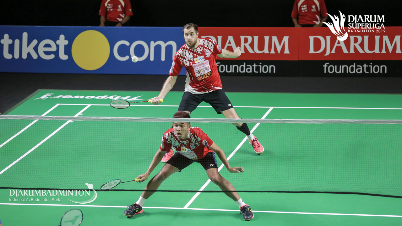 Kevin Sanjaya SUKAMULJO+Mohammad AHSAN (DJARUM KUDUS) mengembalikan shuttlecock
