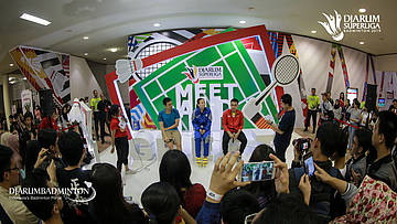 Suasana Meet and Greet Hendra SETIAWAN (JAYA RAYA JAKARTA), ZHANG Beiwen (BERKAT ABADI) dan Leo Rolly CARNANDO (DAIHATSU ASTEC)