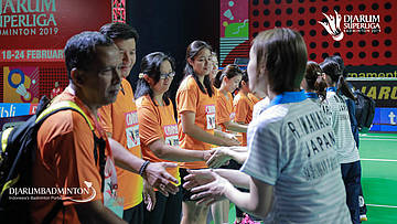 Women's Team Mutiara Cardinal Bandung bersalaman dengan Saishunkan Nihon Unisys