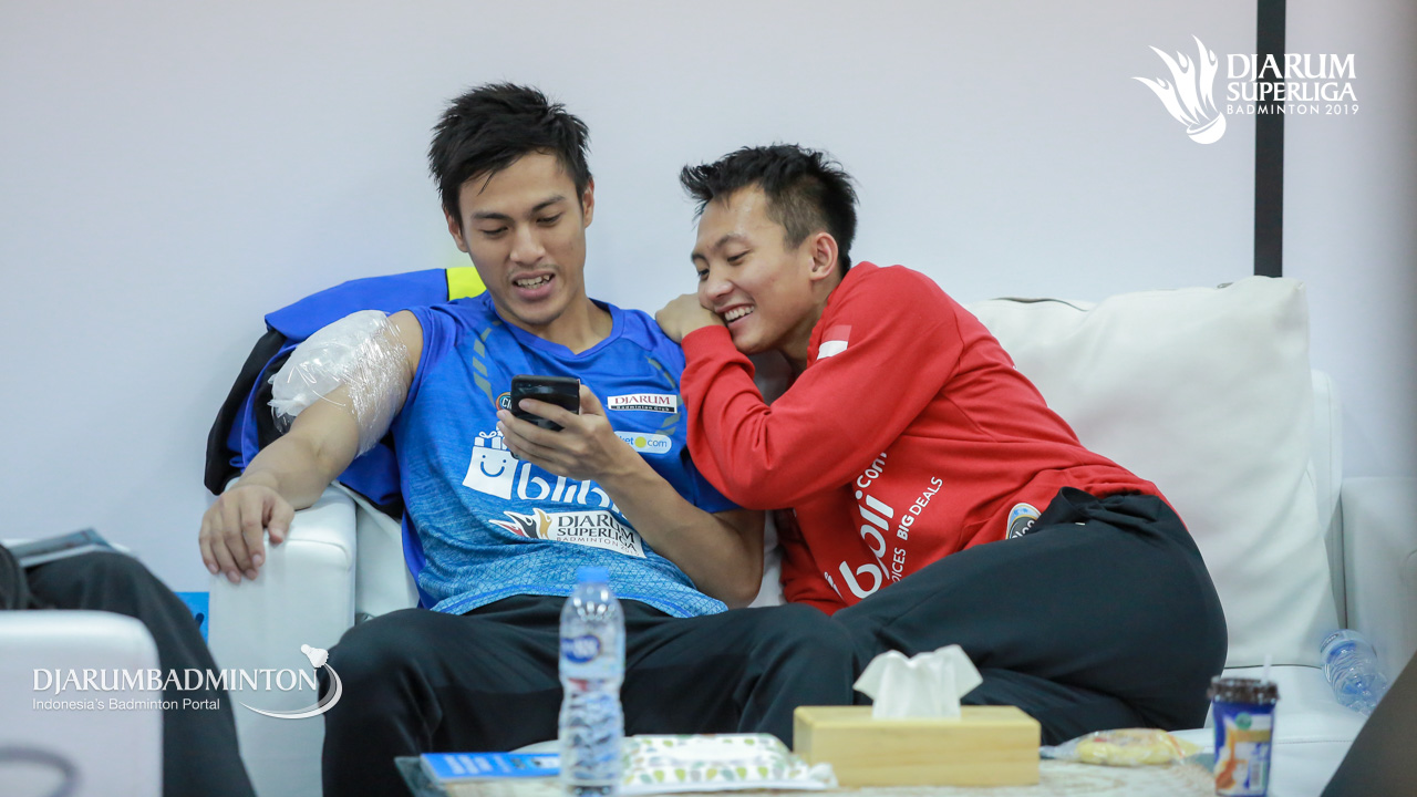 Ihsan Maulana MUSTOFA (DJARUM KUDUS) dan Shesar Hiren RHUSTAVITO (DJARUM KUDUS) saat berada di player lounge