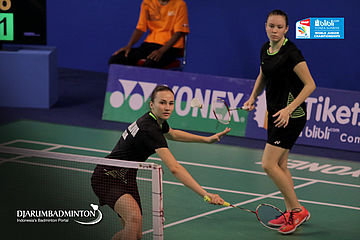 Anastasiia Shapovalova/Anastasiia Semenova (Rusia) Mencoba Mengembalikan Shuttlecock