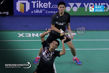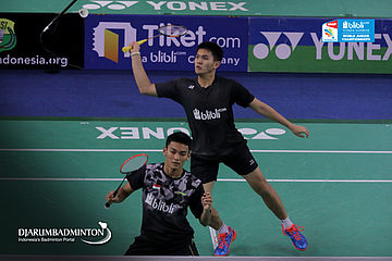Muhammad Shohibul Fikri/Adnan Maulana (Indonesia) Berusaha Menggapai Shuttlecock