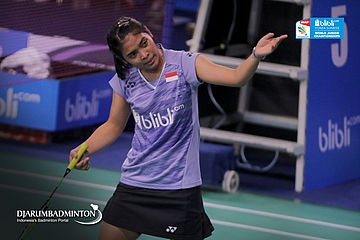 Gregoria Mariska T (Indonesia)Mengembalikan Shuttlecock Kearah Lawan