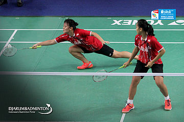 Agatha Imanuela/Siti Fadia Silva (Indonesia) Mengembalikan Shuttlecock Kearah Lawan
