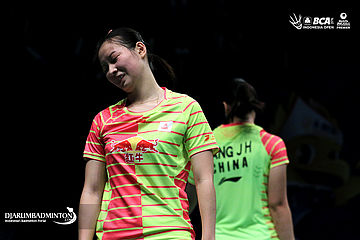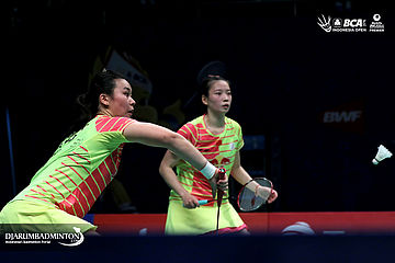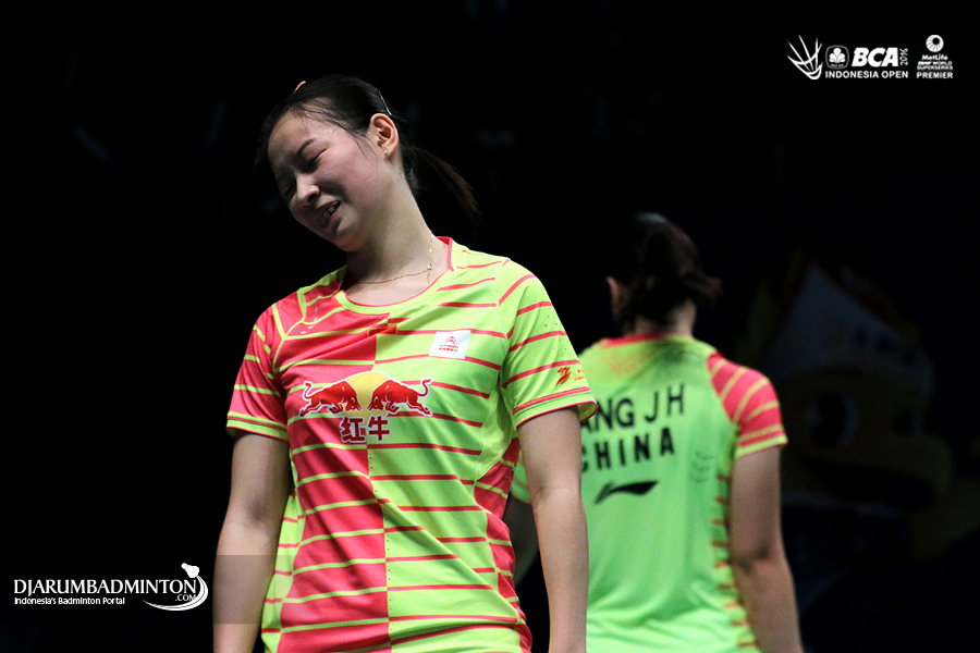 Huang Yaqiong/Tang Jinhua (Tiongkok) bersiap menyambut pengembalian