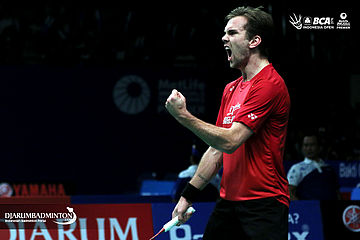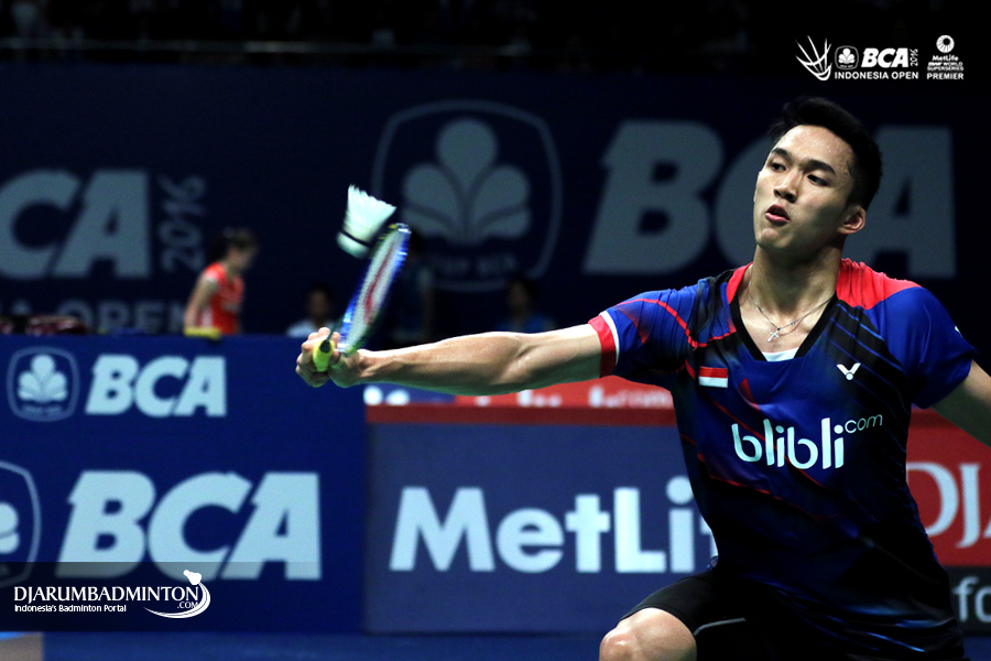 Jonatan Christie (Indonesia) mengembalikan shuttlecock