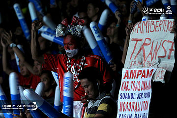 Pendukung fanatik bulutangkis Indonesia tetap semangat memberikan dukungan