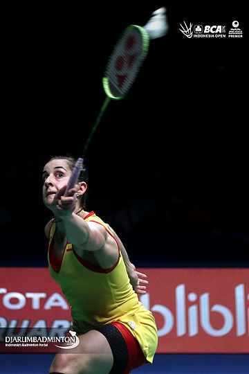 Carolina Marin (Spanyol) mengembalikan shuttlecock