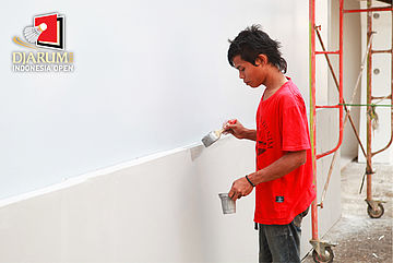 Salah satu pekerja sedang menyelesaikan pengecatan di pintu masuk Nations Pride Arena.