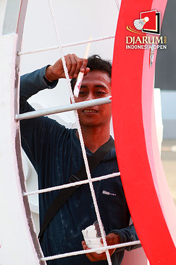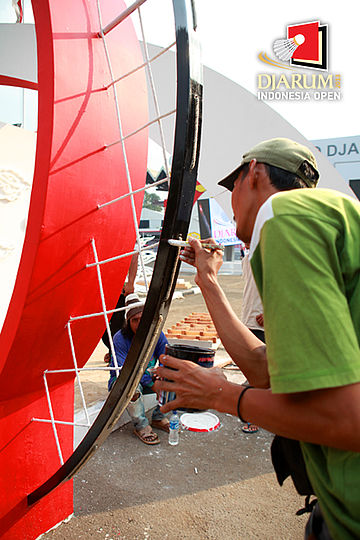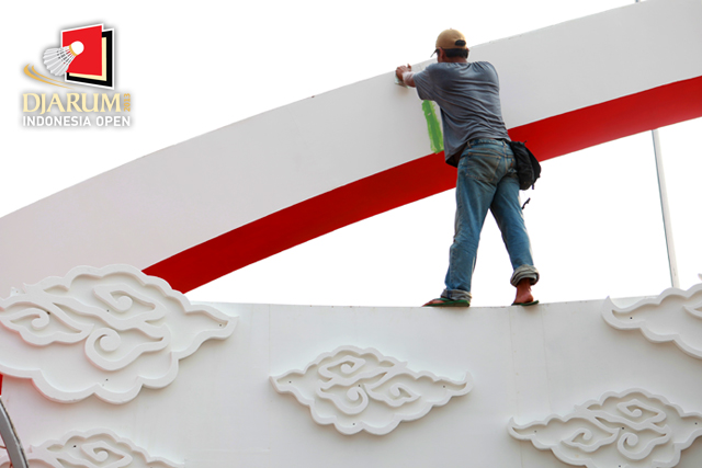 Seorang pekerja tampak sedang mengecat hiasan pintu masuk utama Nations Pride Arena.