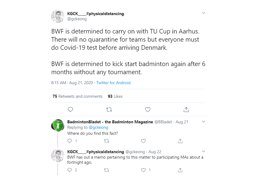 Sekretaris Jenderal BAM, Kenny Goh mengklaim bila BWF telah mengeluarkan memo kepada seluruh peserta Piala Thomas dan Uber 2020 untuk bisa bepergian ke Denmark. Sebelumnya, memang terdapat keraguan bila turnamen tersebut bisa dihelat sesuai jadwal, mengingat pandemi yang masih terjadi di hampir setiap negara.