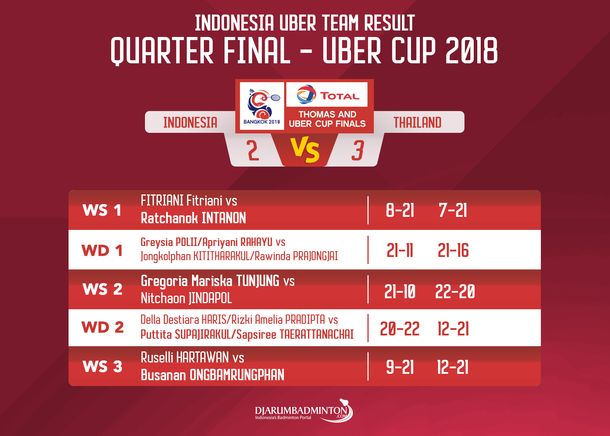 Semifinal Piala Uber 2018 akhirnya mempertemukan tim Tiongkok dengan Thailand dan Jepang dengan Korea. Laga tersebut akan berlangsung besok (25/5) mulai pukul 12.00 waktu setempat.
