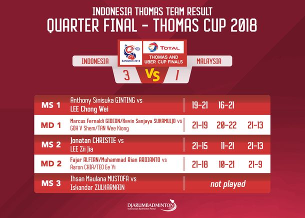 Hasil ini membawa Indonesia menembus empat besar Piala Thomas 2018. Indonesia kemudian akan berhadapan dengan Tiongkok pada babak semifinal. Pertandingan akan berlangsung petang nanti (25/5) di Impact Arena Bangkok, mulai pukul 18.00 waktu setempat. Partai semifinal lainnya akan mempertemukan juara bertahan, Denmark dengan Jepang.