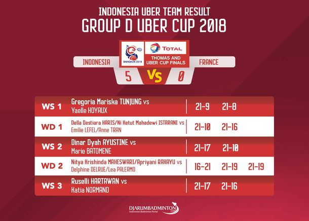Berikut hasil lengkap pertandingan tim Uber Indonesia VS Perancis :