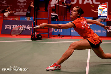 Carolina Marin (ESP) mengembalikan shuttlecock ke arah lawan
