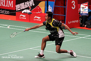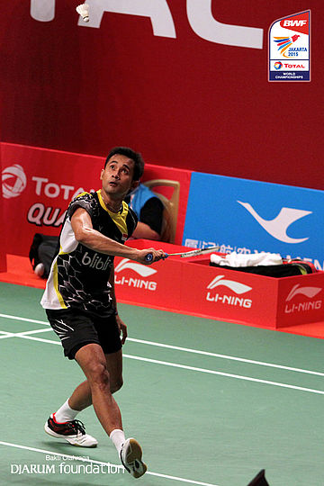Dionysius Hayom Rumbaka (INA) melakukan backhand
