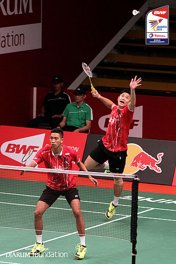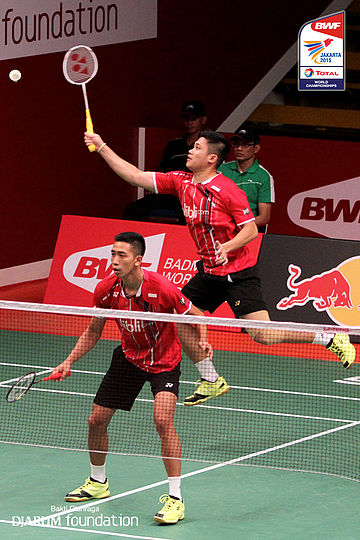 Wahyu Nayaka A/Ade Yusuf (INA) bersiap melakukan smash
