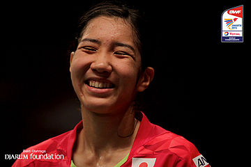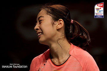 Ekspresi Kurumi Yonao (JPN) saat gagal mengembalikan shuttlecock