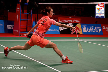 Wang Shixian (CHN) berusaha menggapai shuttlecock