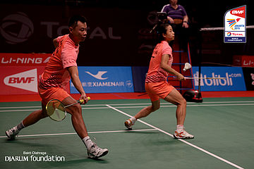 Xu Chen/Ma Jin (CHN) menahan serangan lawan