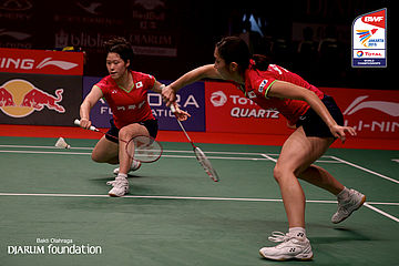 Naoko Fukuman/Kurumi Yonao (JPN) menahan serangan lawan