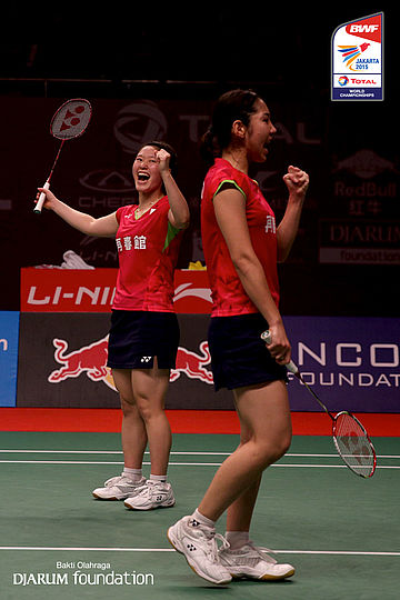 Ekspresi Naoko Fukuman/Kurumi Yonao (JPN) setelah memenangkan pertandingan