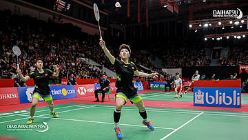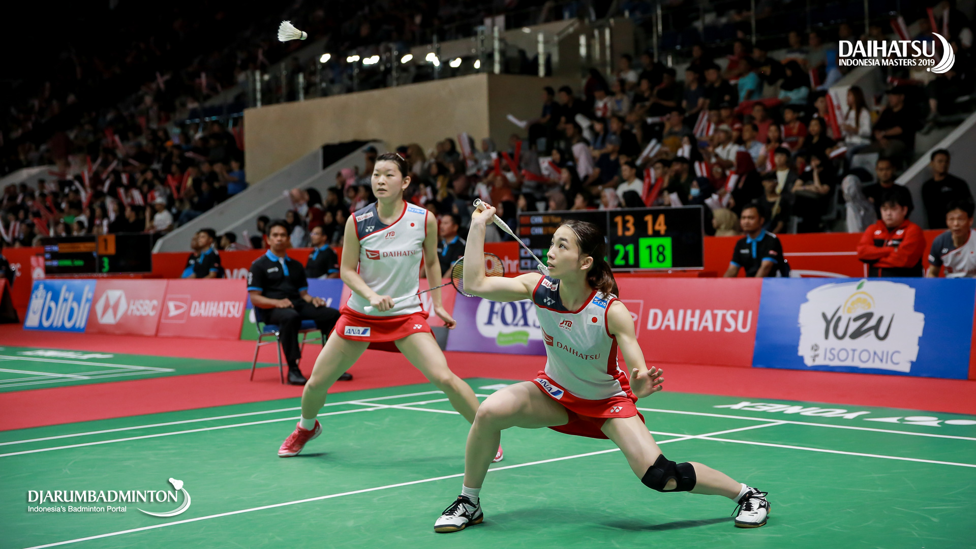 Misaki MATSUTOMO/Ayaka TAKAHASHI (Japan) berusaha mengembalikan serangan